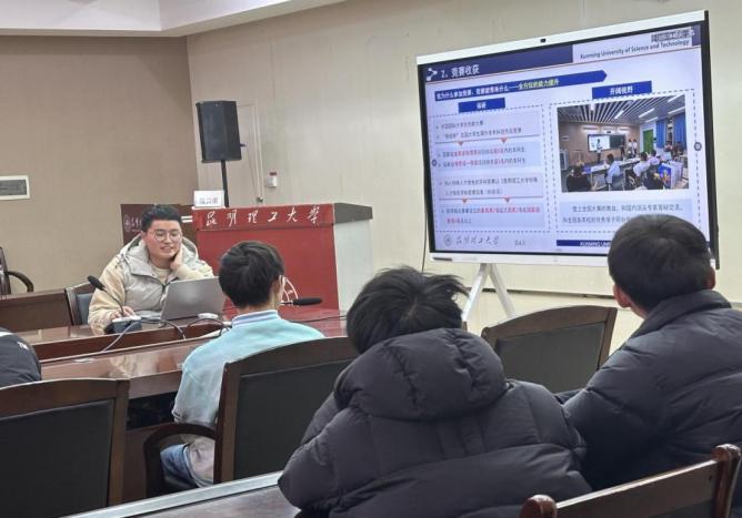研究生普开蕊受邀参加分享会。他与同学们分享了自己的参赛过程和收获感悟。讲述了团队成员在比赛中团结协作,互相勉励,共同攻克难题的成长故事。“坚持比什么都重要”是普开蕊此次参赛最大的收获,他鼓励大家在勇攀科学高峰的道路上一定要坚定信心、不惧困难、善于总结。